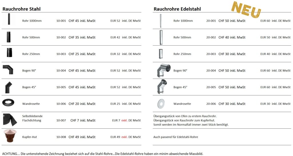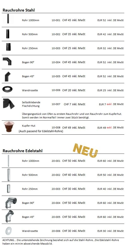 Lange Rede kurzer Sinn… ich verkaufe einwandige Rauchrohre in schwarz (Lack bereits eingebrannt) der Klasse T600. Dieser Rohre passen ideal auf den TINY STOVE. Da die Dichtung der Klasse T300 entspricht, empfehle ich eine mindest Steigzone von 50cm. Mit dieser Distanz zur Hitzequelle habe sehr gute Erfahrungen gesammelt.